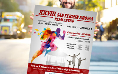 Diseño e impresión del Cartel para el XXVIII Cross de San Fermín organizado por Lore Txorta Elkartea 1 de JULIO - UZTAILA 1 Categorias - Mailak - Senior eta Beteranoak. 7.000m. 11:00 - Benjaminak. 550m. 12:00- Alebinak. 780m. 11:50- Infantilak. 1.100m. 11:40 Izen...